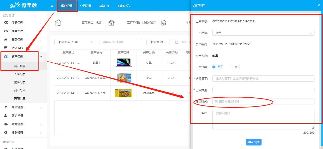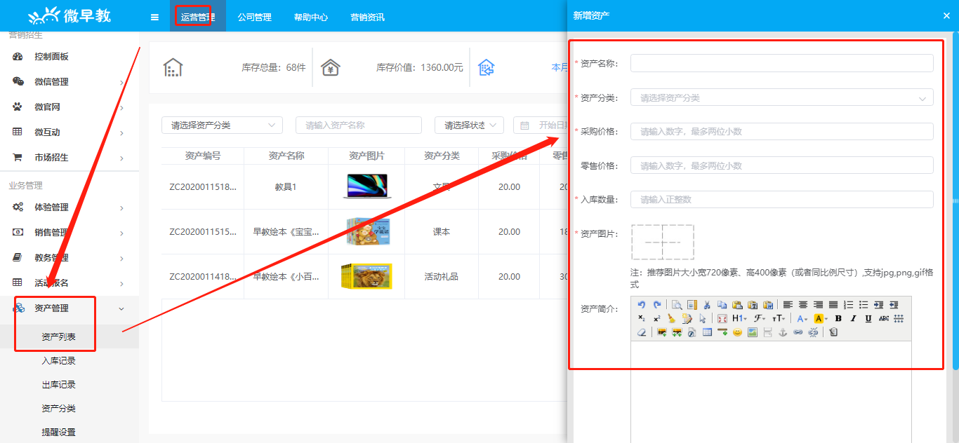 咱们每个机构都会购买或者出售运营当中物资物料,所以就会出现很多入库和出库的需求,这些资产的统计和盘点是我们所必须要做的工作。微早教就是根据机构的实际需求推出了资产管理的功能。